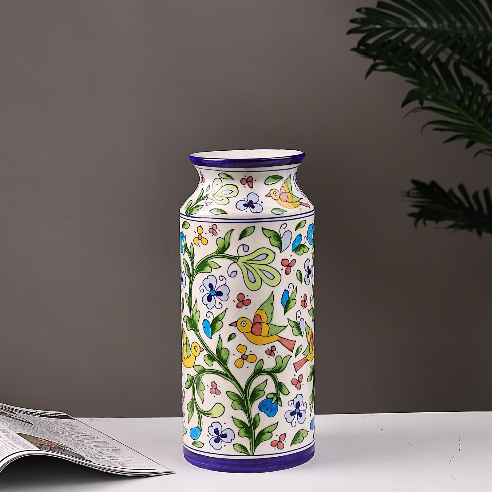 Discover the perfect blend of traditional artistry and modern elegance with our Blue Pottery Floral Vase featuring intricate bird motifs. This stunning home décor piece is ideal for adding a touch of sophistication to your living spaces, making it a must-have for all art lovers. Handcrafted with precision, the vase showcases the distinct techniques of Blue Pottery, a centuries-old craft admired for its delicate designs and vibrant palette.